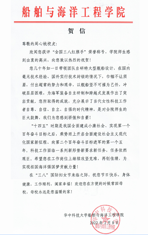 日前,我院向中国船舶701所周心桃校友发去贺信,祝贺其获评“全国三八红旗手”荣誉称号。周心桃校友给母院回信答谢,她表示收到贺信非常激动,这是对自己巨大的鼓励,能为母校争光,是她的荣幸。她对学弟学妹们寄予厚望,希望他们珍惜当下,努力学习,日后为国家的富强、为中华民族的复兴做出自己的贡献,实现自己的人生价值,同时也获取自己的幸福人生。