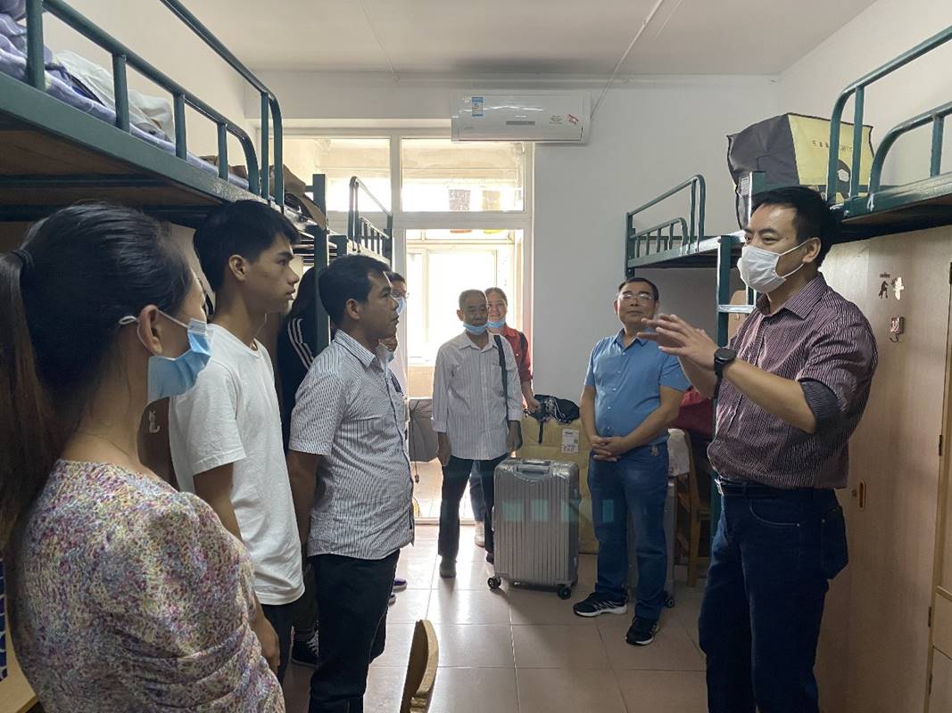 党委书记王作红、党委副书记谢宇翔来到韵苑13栋一同迎接新生,并走访新生寝室问候新生及家长们。