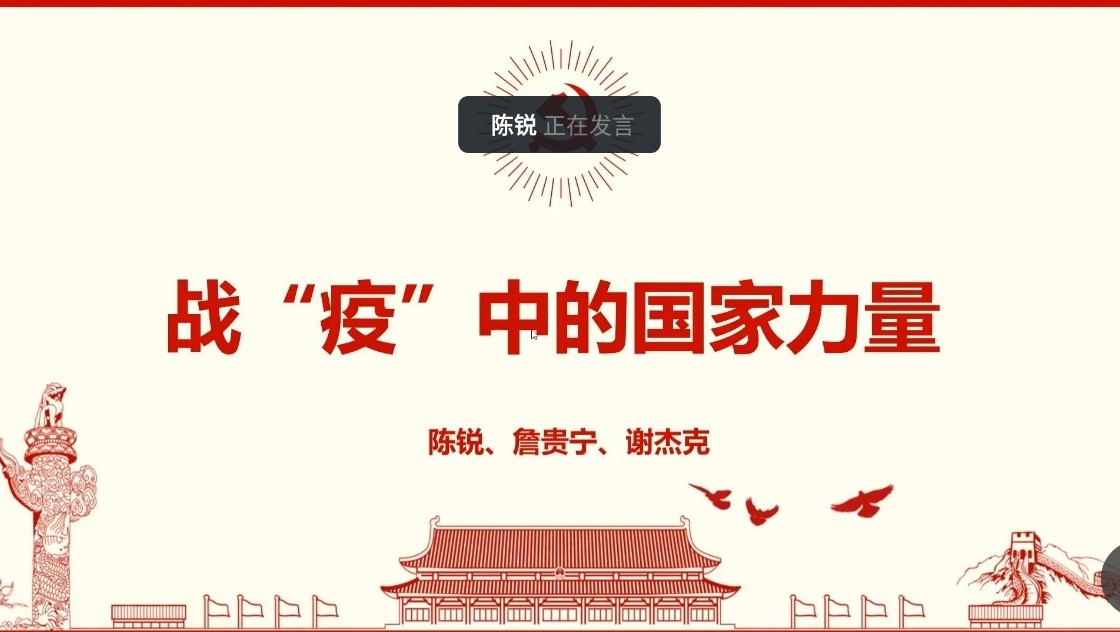 16级船卓轮机党支部陈锐首先介绍了国内外疫情发展情况和防疫措施。随后,船海研究生第二党支部谢杰克从抗疫模式、社会理念、国家角色和救治方法等四个方面对比分析了中国与美英等国的抗疫之路。通过这次战“疫”,我国向世界展示了何为中国力量,中国力量又带来了抗疫的中国担当、中国经验、中国成功。谢杰克最后总结道:“通过这次疫情大考,我们应该在对比、借鉴、反思、创新中,进一步改进我们国家的治理体系,不断以改革创新推动国家治理现代化,走出自己的现代化发展道路”。