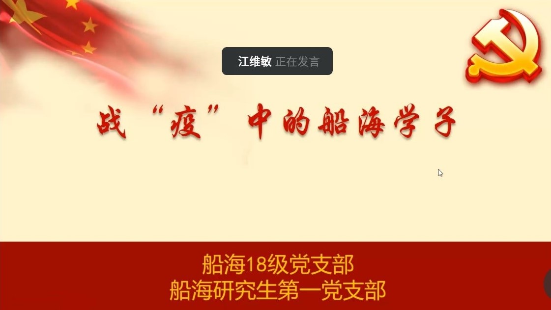 船海本科18级党支部江维敏从钻石公主号说起,谈到了移动的方舱医院和疫情下的美国航母,最后分享了疫情下船海学子应该怎么做。她勉励船海学子要坚持中国之“帜”,常怀中国之“志”,坚持中国之“智”,以实现中国之“治”!