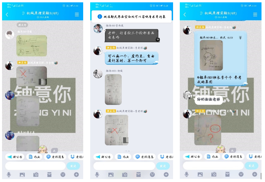 《机械原理实验》课堂上,同学们将自己所画的机械简图发到QQ中,老师地对同学们提交的机械简图进行耐心指导并指出其中的错误。还有部分同学一直通过打电话的方式进行沟通,互相帮助,解决学习上的疑难问题。