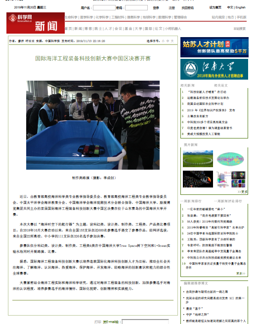 2019年11月8日至10日,由教育部高校海洋科学类专业教学指导委员会、教育部高校海洋工程类专业教学指导委员会、国际涉海高校联盟、中国太平洋学会海洋教育分会、中国海洋学会海洋观测技术分会指导,中国海洋大学、励展博览集团主办的首届国际海洋工程装备科技创新大赛中国区决赛在中国海洋大学举办。大赛前身为“Oi中国水下机器人大赛” 自2013年举办以来,每年一届,现已成功举办五届。