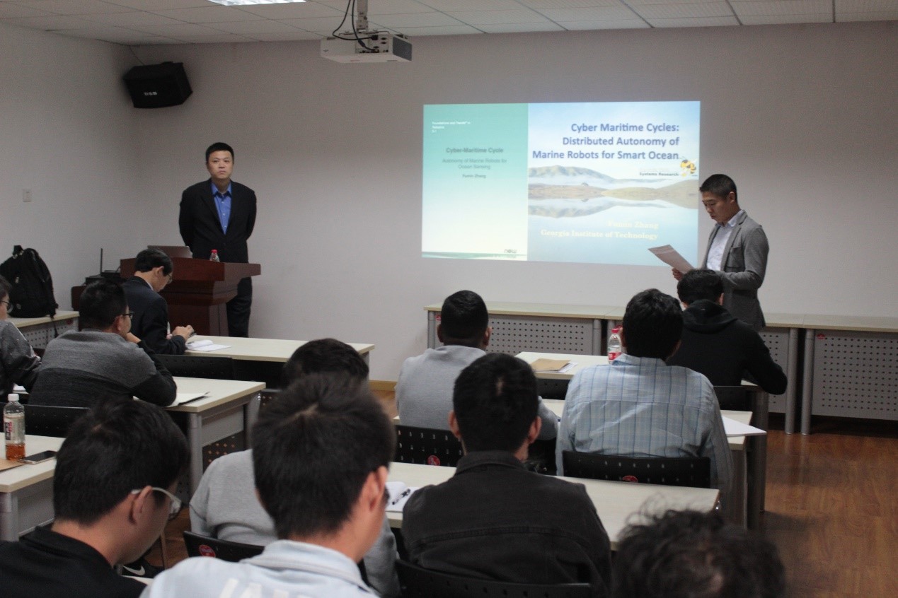 杨少龙、向先波老师邀请来访我院,并为我院师生作了题为“Cyber Maritime Cycles: Distributed Autonomy of Marine Robots for Smart Ocean”的学术报告,我院向先波教授和杨少龙老师等相关课题组老师、博士和硕士研究生参加了此次学术交流活动,会场由杨少龙老师主持。
