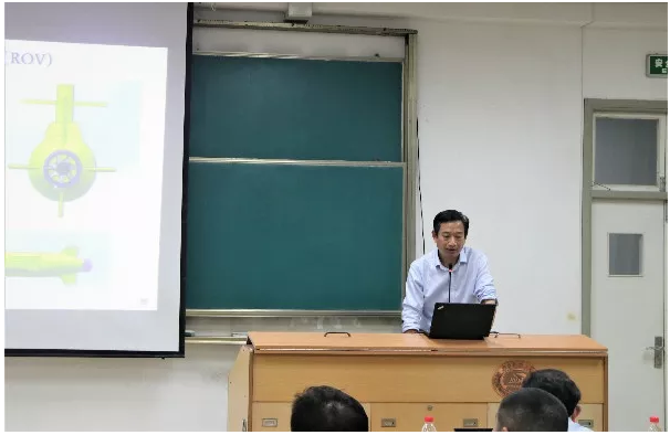 轮机工程系主任唐国元副教授从智能船舶的发展趋势、轮机人的使命任务和学科特色等方面对轮机工程专业进行了全面的介绍。随后。唐国元详细介绍了轮机专业的特色、师资力量与发展历程,让同学看到在这里不仅可以获得丰富学识,还可以得到充分的实践锻炼。唐国元特别强调,轮机工程专业的学生就业面很广,同学们应该多方面发展。之后,唐国元老师为同学们展示了“鱼鹰I号”“蓝鲸号”等科研成果及尖端设备,让同学们充分领略到轮机工程的强大实力。
