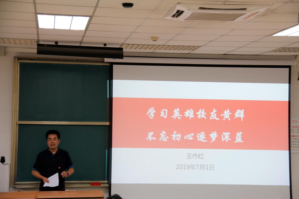 党委书记王作红以“学习英雄校友黄群,不忘初心逐梦深蓝”为主题,为全院学生党员上了一堂生动的思政课。