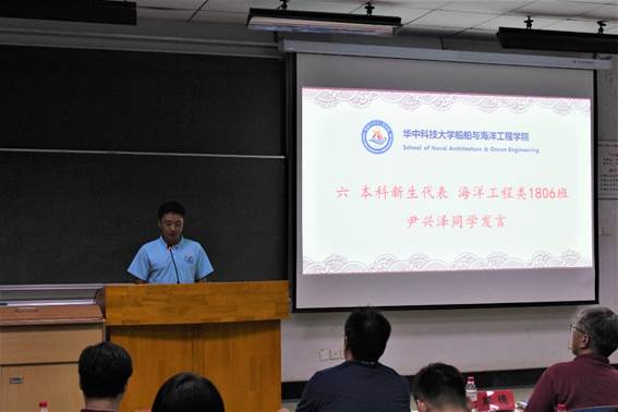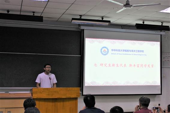 研究生新生代表靳丰富同学对在开学季奔波忙碌的各位老师表示感谢,并分享了自己的本科成长经历。他说,把一件件小事做好,就是成功,全体2018级新生要肩负起应有的责任与担当,开拓进取、勇于创新,铸造属于船海人的美好明天。