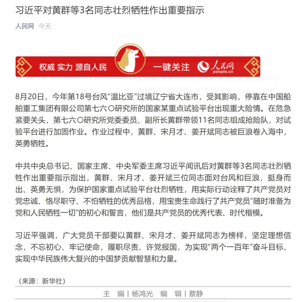 8月20日,中船重工七六〇所党委委员、副所长、研究员,华中科技大学1985级校友黄群等3名同志在台风抢险过程中不幸罹难、壮烈牺牲。中共中央总书记、国家主席、中央军委主席习近平闻讯后作出了重要指示。