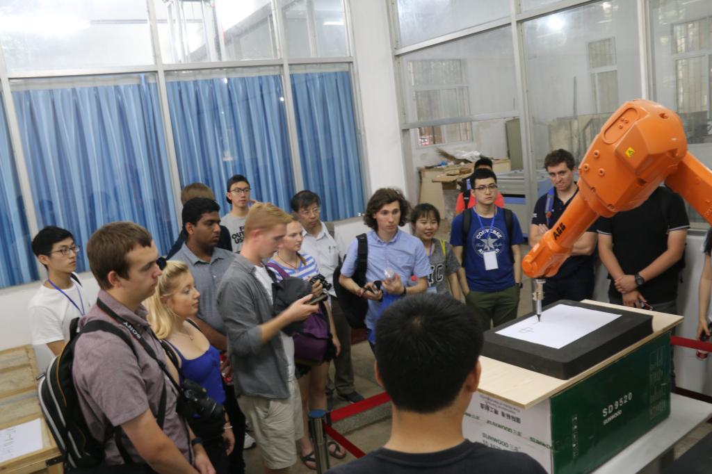 对来访师生表示欢迎,并详细介绍我院基本概况。来访领队熊冶平老师高度赞扬了我院交换生在南安普顿大学的表现,并表示将与我院进行更加密集深入的交流活动,除交换生项目外,“3+1”、“2+2”项目也将持续推进。随后,我院老师带领南安普顿大学的师生团队参观了轮机自动化实验室、六自由度运动仿真实验室、船舶推进及三维航行模拟推进实验室。我院学生控制机械手设备写下“中英交流”的祝词,并现场指导南安普顿大学的同学进行操作。之后,两校师生赶赴国家光电实验室了解了我校在相关方面的科研成果。