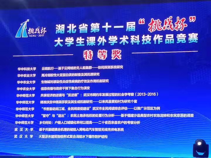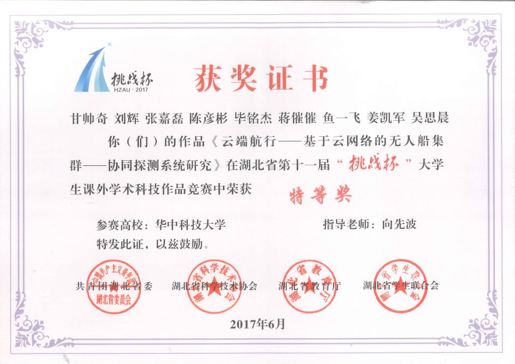 6月9日,由团省委、省科协、省教育厅、省学联联合主办的湖北省第十一届“挑战杯”大学生课外学术科技作品竞赛终审决赛暨闭幕式在华中农业大学举行。来自全省72所高校的693件作品参加本届竞赛,我院向先波老师指导的学生团队作品“云端航行——基于云网络的无人船集群协同探测系统研究”,荣获本届“挑战杯”省赛的特等奖。