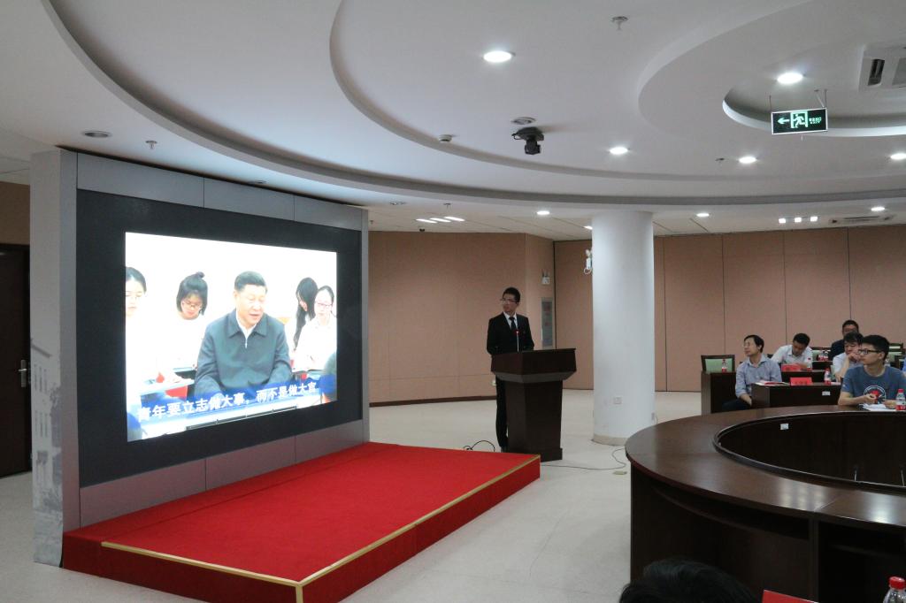 主题党课环节,4名优秀的毕业生党员代表带领大家重温习总书记对青年的四段讲话,并结合自己的经历和感悟进行了分享:本科生党员袁定兴与大家分享了他选择从小立志投身祖国的国防事业,为了建造性能优良的战舰而奋斗的心路历程;硕士生党员王迪选择了国家开发银行作为自己实现人生理想的第一站,提出要坚持梦想、树立榜样,为祖国基础建设贡献自己的力量;本科生党员李靖回顾其大学四年努力学习终获国外名校offer,并立志深造后回国报效祖国;博士生党员陈莺分享了她如何在研究所、知名企业和基层单位作出选择,以及今后如何在武汉市“双百万计划”中发挥自己的作用。