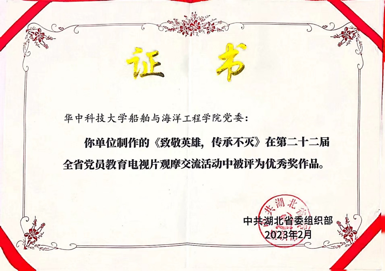 2023年2月,我院作品《致敬英雄,传承不灭》在全省党员教育电视片观摩交流活动中被评为优秀奖作品,获得中共湖北省委组织部的表彰。
