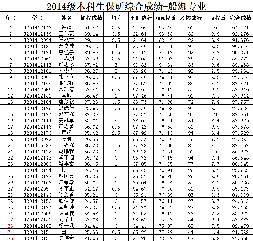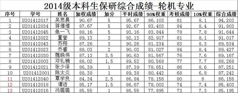 经过笔试,现将2014级足球直播857 专业和轮机工程的保研综合成绩进行公示。对公示结果有异议的同学,可以于9月19日下班前向院办卢慧老师反映(027-87543258)。