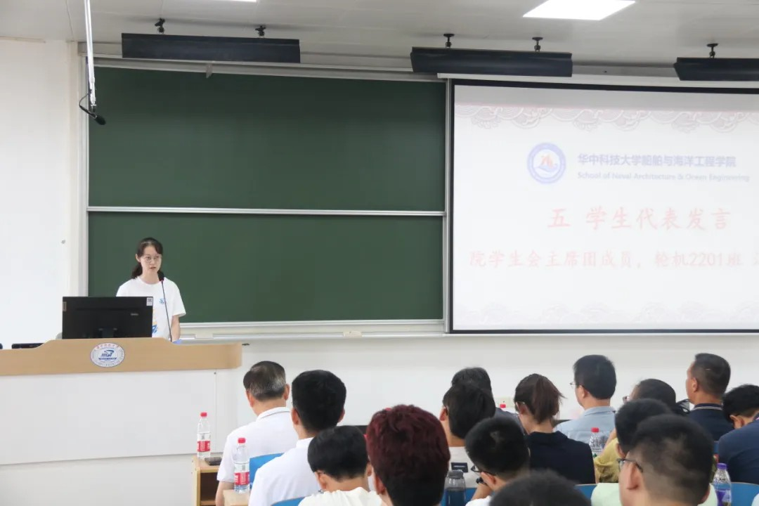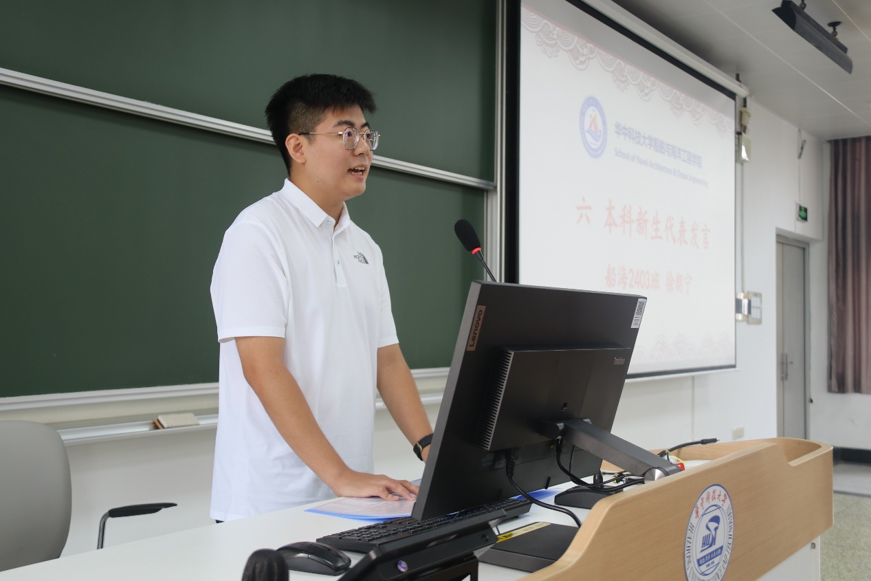 接着校青马班成员、院学生会主席团成员江晓楠为船海新生们分享了她的大学探索之路。勉励大家在充满挑战、充满机遇的大学生活中全面提升自己,敢于尝试,不断坚持,永葆热爱,在华科大长志气,养才气,显锐气,不辜负美好的青春年华。