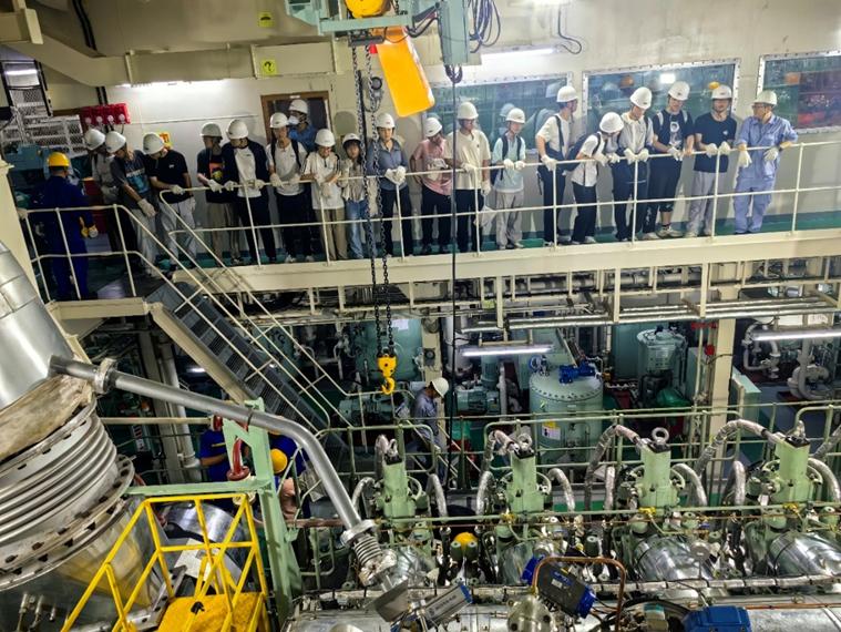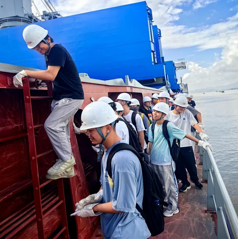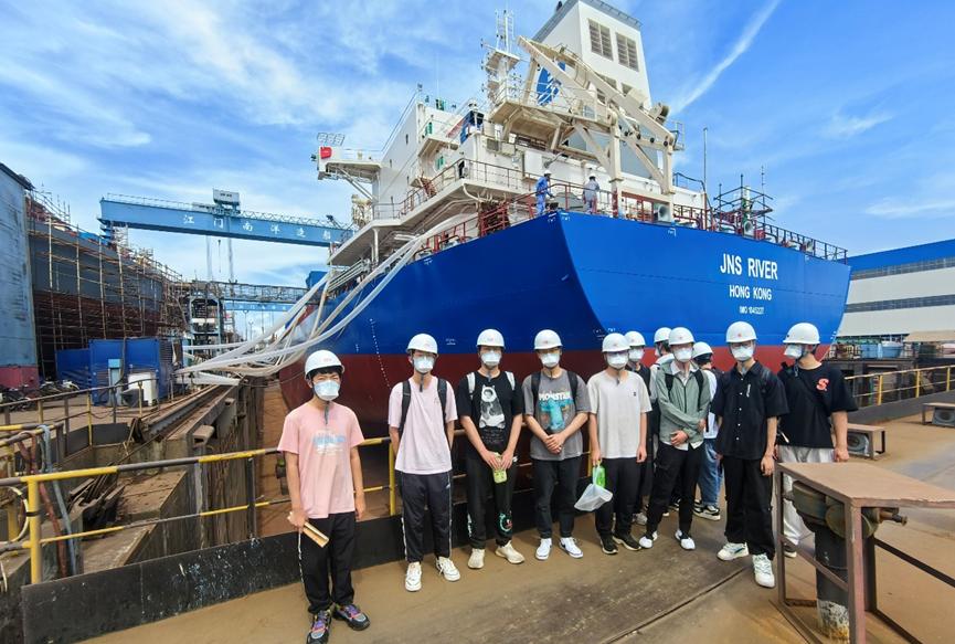 在江门南洋船舶公司实习实践期间,本科2002级校友、江门南洋船舶人力资源部马龙部长结合该公司建造的40000DWT级灵便性散货船特点,引导同学们参观了船体平面分段流水线、曲面分段流水线、船坞总段合拢现场,并到码头深入完工船舶的机舱、厨房、船员及船长室、驾驶甲板、货舱。根据现场见闻,并解读灵便性散货船图纸,同学们深刻理解了灵便性散货船的设计、建造与布置特点,掌握了船舶出坞的全过程。