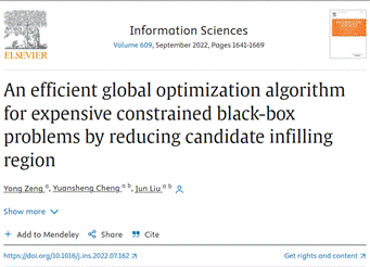 以及论文“An efficient global optimization algorithm for expensive constrained black-box problems by reducing candidate infilling region”(候选解采样空间缩减的高效全局优化算法)。我校为论文第一署名单位,2018级博士生曾勇为第一作者,刘均教授为论文的唯一通讯作者,程远胜教授为共同作者。