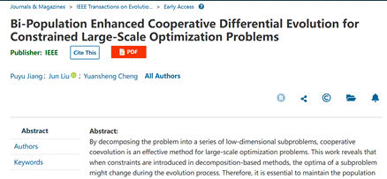 船舶结构力学与优化设计研究所程远胜教授团队论文“Bi-Population Enhanced Cooperative Differential Evolution for Constrained Large-Scale Optimization Problems”(求解大规模约束优化问题的双种群增强协同差分进化算法)。我校为论文第一署名单位,2019级博士生江璞玉为第一作者,程远胜教授为论文的唯一通讯作者,刘均教授为共同作者。 《进化计算》期刊(IEEE transactions on evolutionary computation, 属中科院一区Top,影响因子14.3,CiteScore排名计算机理论方法第2,JIF排名计算机人工智能领域第6。