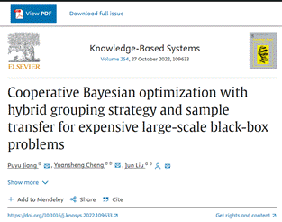 近2年,程远胜教授团队针对目标/约束计算耗时的昂贵大规模优化问题,还在《知识系统》(Knowledge-Based Systems, 中科院一区Top,影响因子8.8) 发表了论文“Cooperative Bayesian optimization with hybrid grouping strategy and sample transfer for expensive large-scale black-box problems”(使用混合分组策略及样本迁移的协同贝叶斯优化算法)。我校为论文第一署名单位,2019级博士生江璞玉为第一作者,刘均教授为论文的唯一通讯作者,程远胜教授为共同作者。该算法将贝叶斯优化以分解的方式扩展至求解昂贵大规模优化问题上并可以重复利用历史样本数据。