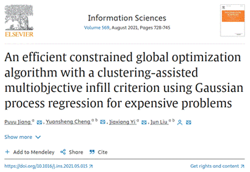 针对分解后的耗时低维子问题高效求解方法,程远胜教授团队还在《信息科学》(Information Sciences, 中科院一区Top,影响因子8.1) 发表了论文“An efficient constrained global optimization algorithm with a clustering-assisted multiobjective infill criterion using Gaussian process regression for expensive problems”(聚类辅助多目标采样的高效全局优化算法)。我校为论文第一署名单位,2019级博士生江璞玉为第一作者,刘均教授为论文的唯一通讯作者,程远胜教授和易家祥硕士为共同作者。