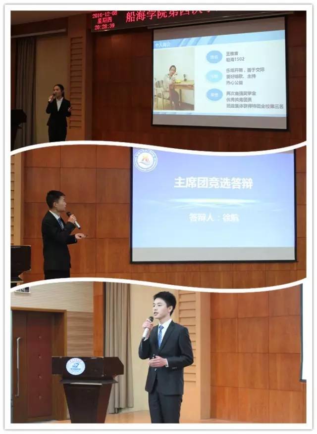候选人的答辩精彩而充满希望。王雅吉致力于制度创新,以“要么不做,要么做到最好“的理念,励志创造一个完美的学生会;徐航选择远方,便只顾风雨兼程,用自己睿智的表达造就高效的工作;周智毅严于律己,满怀热情,勇担责任,他说:“我许你一个别开生面的学生会和一个温暖的船海之家”。