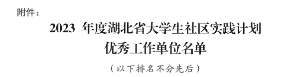 湖北省“大学生社区实践计划”是团省委开展的一项重点项目,旨在引导大学生走进基层社区,广泛参与美好环境与幸福生活共同缔造,服务人民群众、提高社会化能力。我院充分发挥大学生专业特长和资源优势,持续推动大学生社区实践计划走深走实。