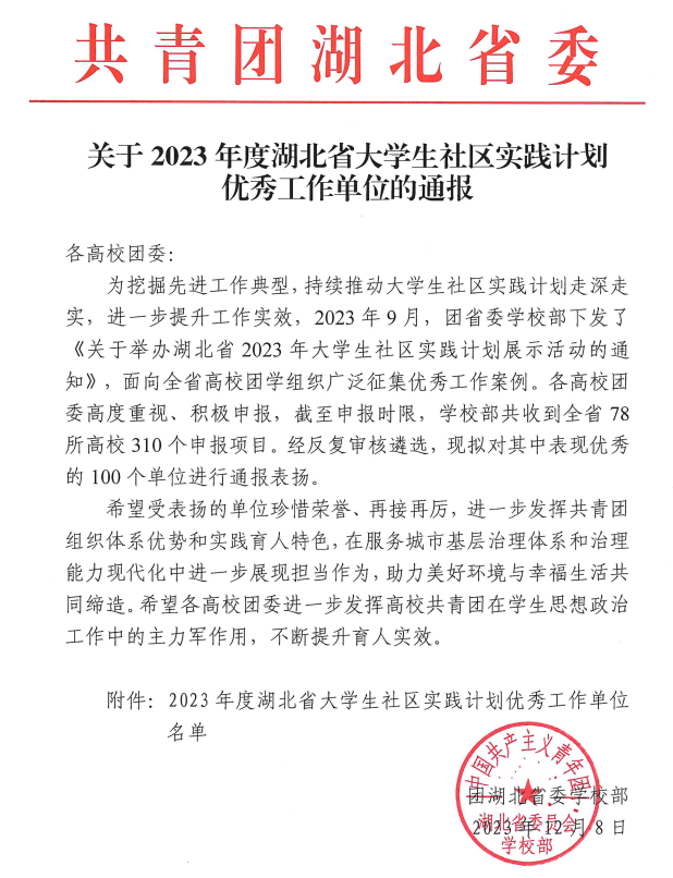 (通讯员:张石磊)2023年12月8日,共青团湖北省委公布了2023年度湖北省大学生社区实践计划优秀工作单位名单。华中科技大学足球直播857