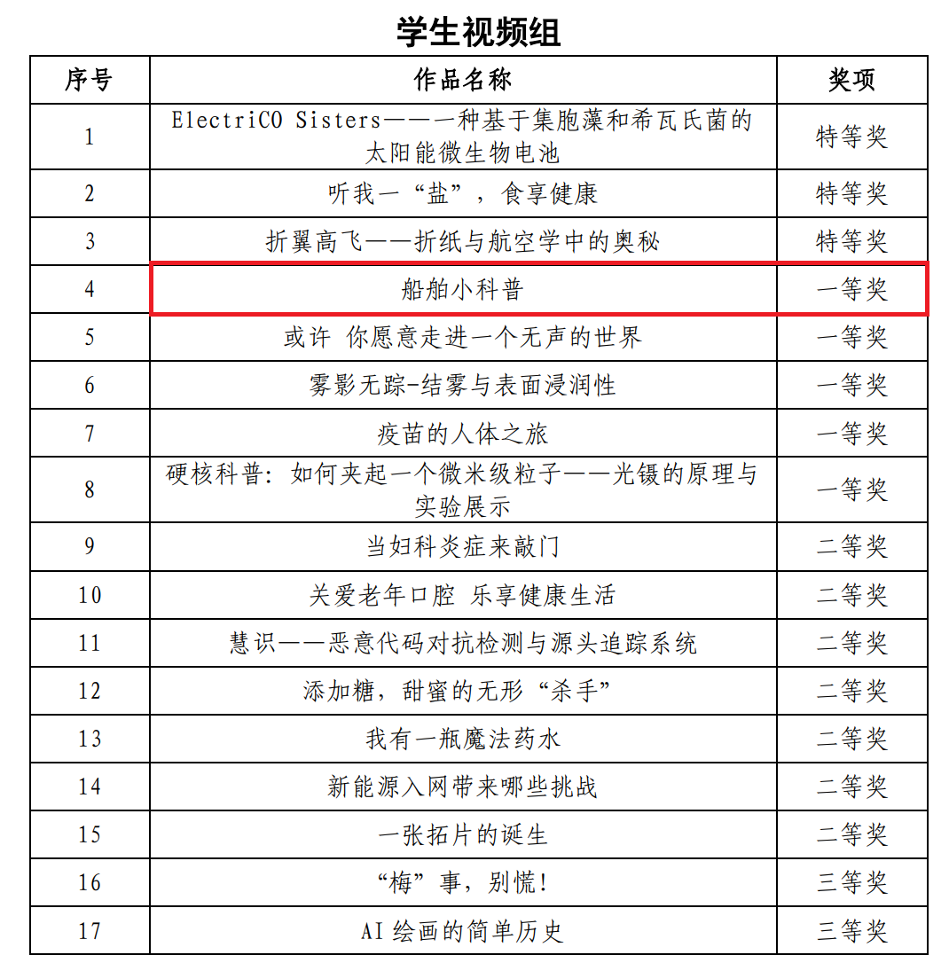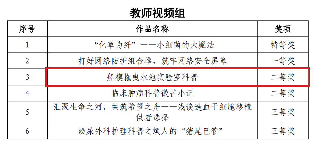 经自主报名、院系把关、资格审查、线下评审等环节,我院宋磊老师拍摄制作的科普视频《船模拖曳水池实验室科普》获评教师组二等奖;陈昱萤拍摄的科普视频《船舶小科普》获评学生组一等奖。