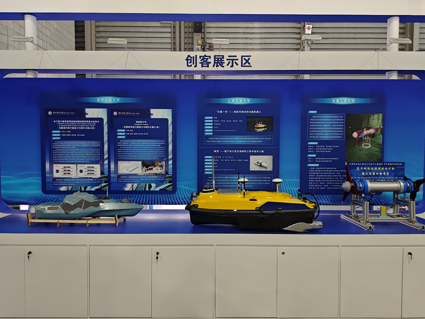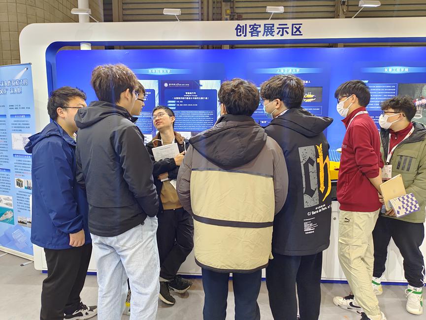 另外,我院两项海航器大赛特等奖作品参与此次中国造船工程学会创客展区展览,分别是A2类特等奖《海洋航行器声诱饵发射的瞬态噪声预报分析技术》与C1-1类特等奖《基于stm32的智能航行船》。我院学生代表积极向各位参展人员介绍两项获奖作品,并与上海交通大学等高校的同学开展交流学习,展现了我院学子崇尚科学、实践求知的精神风貌。